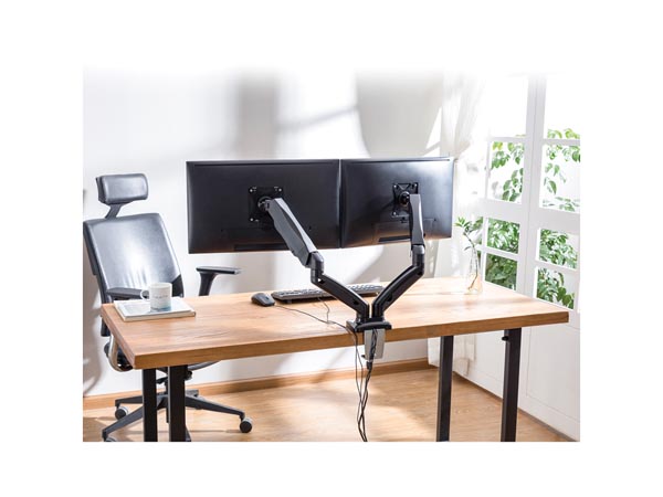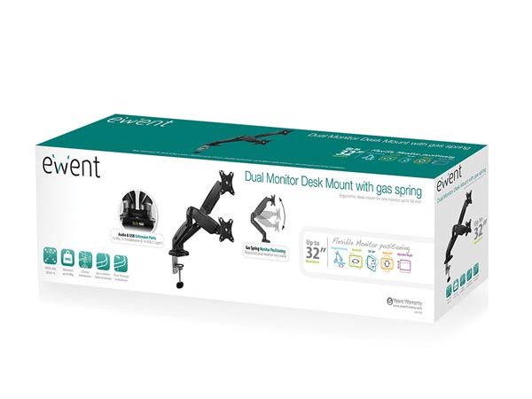 Pas de monitoren aan naar je eigen voorkeur door het instellen van de ideale kijkafstand. De bureausteun is geschikt voor twee schermen tot en met 27 inch met elk een maximum gewicht van 2-6,5kg. De EW1516 is uitgerust met VESA 75x75 en 100x100. Dankzij het handige beeldschermmontagesysteem kun je de monitor zelf op de steun bevestigen. De bureausteun wordt compleet geleverd met alle montagemiddelen voor zowel klem- alsook doorvoermontage.