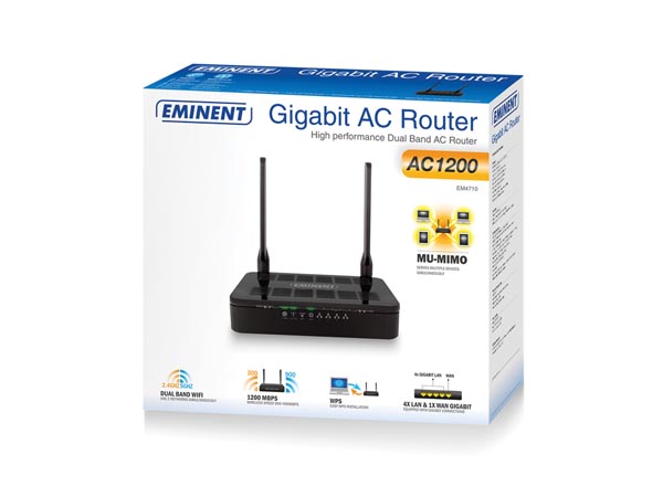 De EM4710 Dual Band AC1200 Router zorgt voor een hoge draadloze netwerksnelheid (300+900Mbps). De EM4710 is uitgerust met twee krachtige antennes en deelt je internetverbinding met hoge snelheid. Gebruik de 2.4GHz en de 5GHz frequentie tegelijk om de hoogste doorvoer te halen en storingen te vermijden. Het AC WiFi netwerk is ideaal om online te gamen en voor het omzetten van muziek, video's en foto's. De Dual Band AC Router is perfect voor kabel- en glasvezelinternet dankzij de Gigabit WAN poort. Naast al deze features is het ook mogelijk om gastnetwerken te maken. Je familie en vrienden kunnen gewoon gebruik maken van je internet, zonder toegang te krijgen tot je complete thuisnetwerk. Met Quality of Service (QoS) geef je voorrang aan applicaties of data zodat deze activiteiten meer bandbreedte krijgen. MU-MIMO zorgt voor een sneller en efficiënter WiFi netwerk.