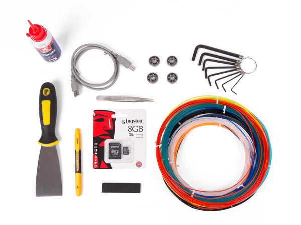 Finetune je Vertex met de unilube smeerolie en de inbussleutels. Bewaar gcode-bestanden op de 8 GB microSD-kaart en print kleine, fijne voorwerpen dankzij het kleurrijke assortiment filament, of werk uw spoelhouder* af met lagers en rubbervoetjes. Bekijk het andere meegeleverde gereedschap hieronder!