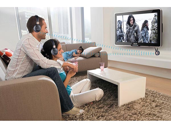 sluit de zender aan op een DC-lader of USB-poort van uw tv en geniet van 40 uur afspeeltijd