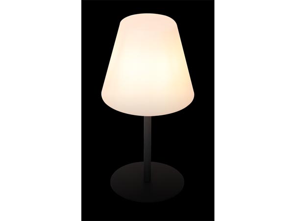 Voorzien van plastic lampenkap en metalen geanodiseerde standaard met poedercoating.