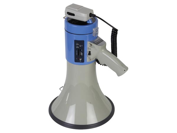 Megafoon met USB-poort en SD-kaartslot (MP3). Met spraakfunctie en sirene. Afneembare antifeedback microfoon met spiraalsnoer, aan/uit-schakelaar en volumeregeling. Behuizing in ABS.