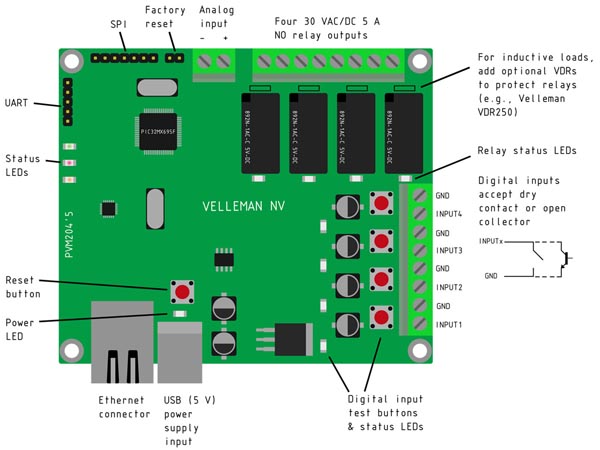 VM204 is een Ethernet-relaiskaart met 4 relaisuitgangen, 4 digitale ingangen en 1 analoge ingang.